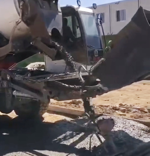 攪制完成后,270度旋轉(zhuǎn)的卸料口來(lái)回澆灌施工處