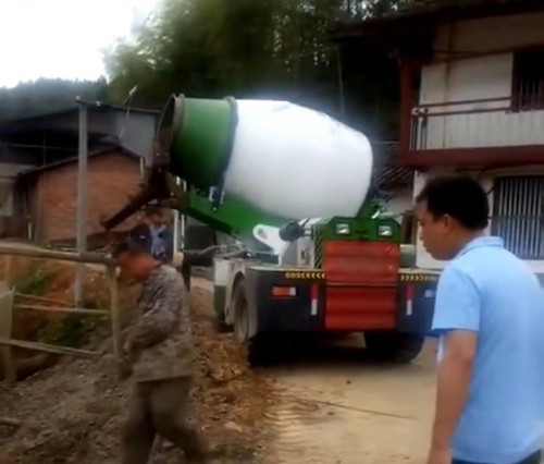 魯樽2.0方自動(dòng)上料攪拌車(chē)在路面僅僅3.5米寬的狹窄山村路上施工